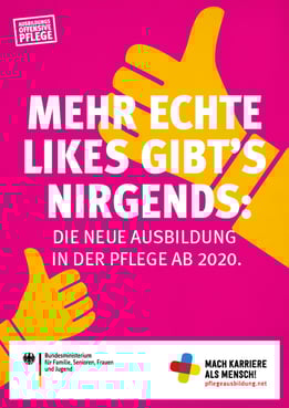 Unter diesem Motto hat das Bundesfamilienministerium eine bundesweite Informations- und Öffentlichkeitskampagne zu den neuen Pflegeausbildungen gestartet. Mit der Kampagne sollen junge Menschen für die Berufe in der Pflege begeistert werden.